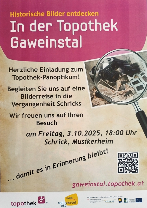 Am Freitag, 3.10.2025, findet das nächste Topothek-Panoptikum statt. Beginn 18 Uhr Musikerheim Schrick Kommen Sie vorbei und tauchen Sie in die Geschichte unseres Ortes ein. |