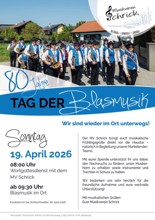 Am 19. April findet der Tag der Blasmusik statt. Nähere Info siehe in der Galerie. |